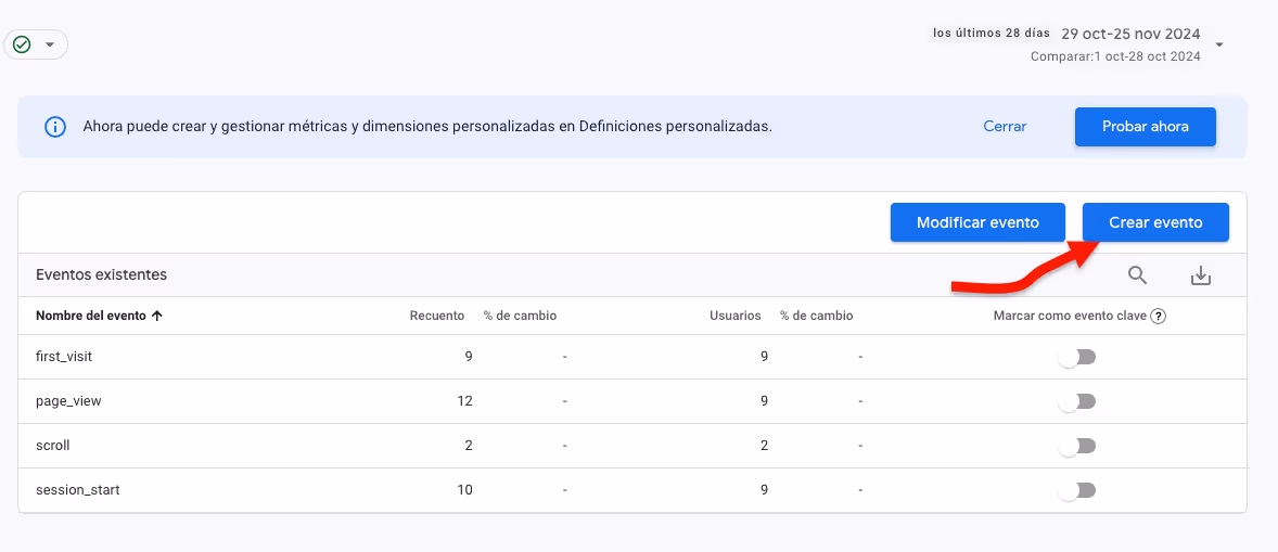 Aunque el sistema genera automáticamente algunos eventos básicos, como vistas de página o scrolls, también te permite crear eventos personalizados adaptados a las necesidades específicas de tu empresa. Estas opciones te brindan mayor flexibilidad para medir acciones importantes, como clics en botones, formularios enviados o descargas de archivos.